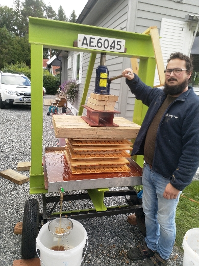 Det var jo vakent utbytte da! Hva havna OG på råsafta på? Jeg og en kompis (mest han) har plukka ca. 230 kg i dag, håper på ca 100 liter juice. Bruker en hydropresse som naboen hans harÅrets første ciderpressing. Ca 100kg epler per pressing. Totalt 210 liter av 300kg epler.![]()