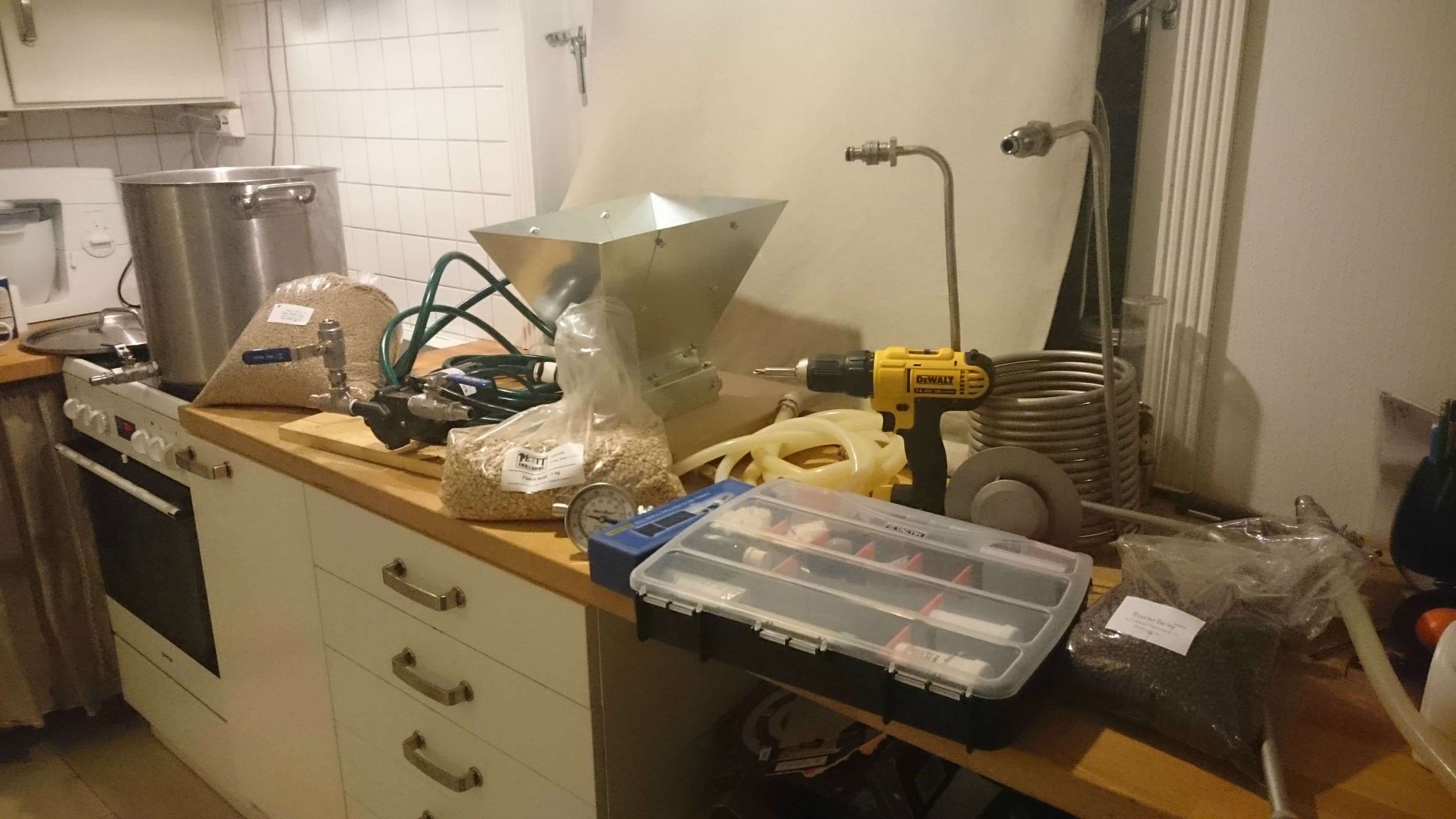 Malt veid opp og malt. Humle klargjort samt vann fylt opp. Good times. Bare å skru på strømmen.