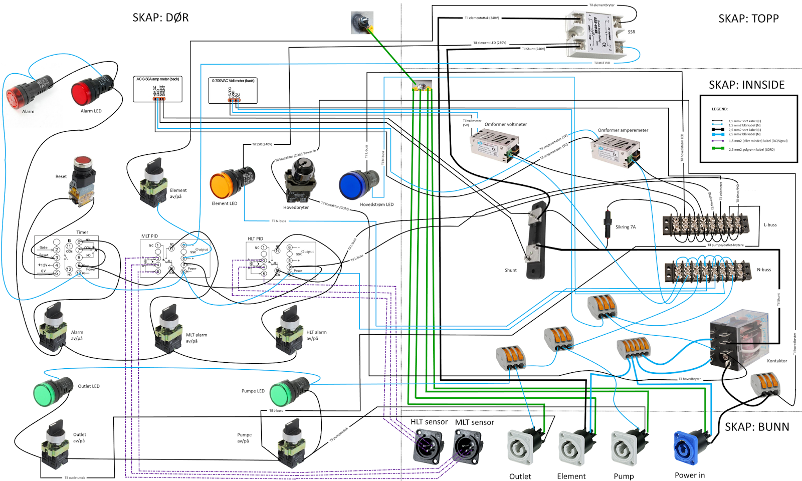 På koblingsskjemaet til Svarstad Ølbryggerlaug virker det som at man svart ledning går inn, at denne går direkte på kontaktor, og deretter til shunt (som vil utgå i vårt case), og så til SSR (for vår del effektregulator) før den går på elementet til slutt. Jordkabel går direkte inn i skapet og til jord. Blå ledning går bare til kontaktor og element.
